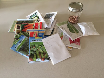 Some we have collected, some we bought, and some were given to us: beans, peas, chard, radishes poppies, lettuce carrots, cauliflower, kale, broccoli, borage, and spinach. We are hoping to be a little more careful about the weeds.